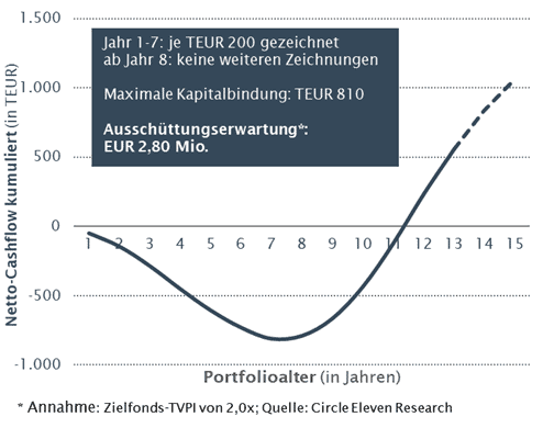 Ab einem Portfolioalter von ca. sieben Jahren und einer Anzahl von 15-20 Zielfonds ist ein Private Equity-Programm weitgehend „eingeschwungen“. Jetzt übersteigen typischerweise die Ausschüttungen die Kapitalabrufe. Aus Netto-Sicht muss nun kein zusätzliches Kapital mehr „eingeschossen“ werden.
